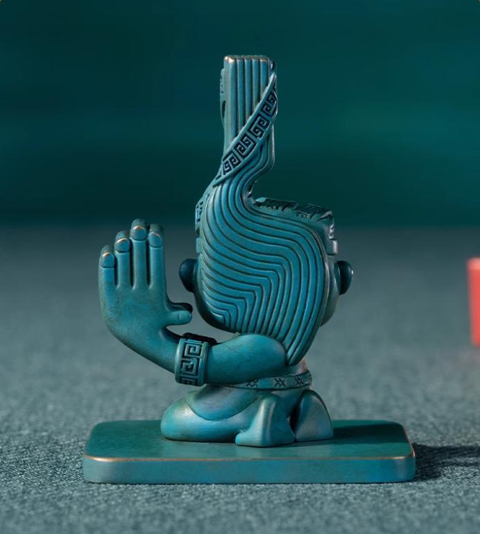- The two symmetrical green figures on the left and right kneel, put their hands together, and pray to the sky. The exaggerated straight hair is like an antenna leading to the sky, just setting up a transparent photo frame. The transparent photo frame is like a door of time and space, connecting the modern with 3000 years ago, traveling through thousands of years, and encountering the wisdom and art that has settled in time.